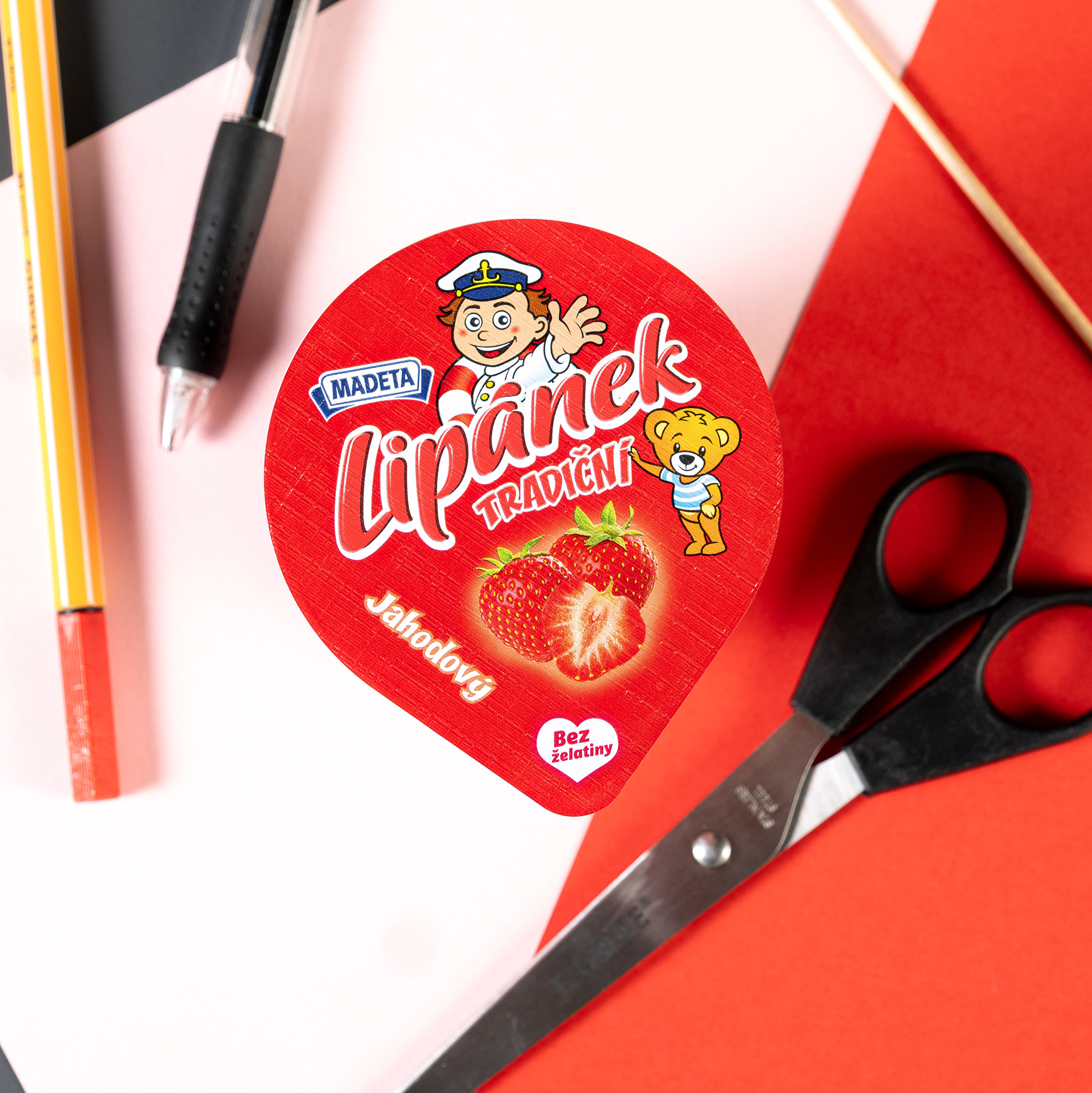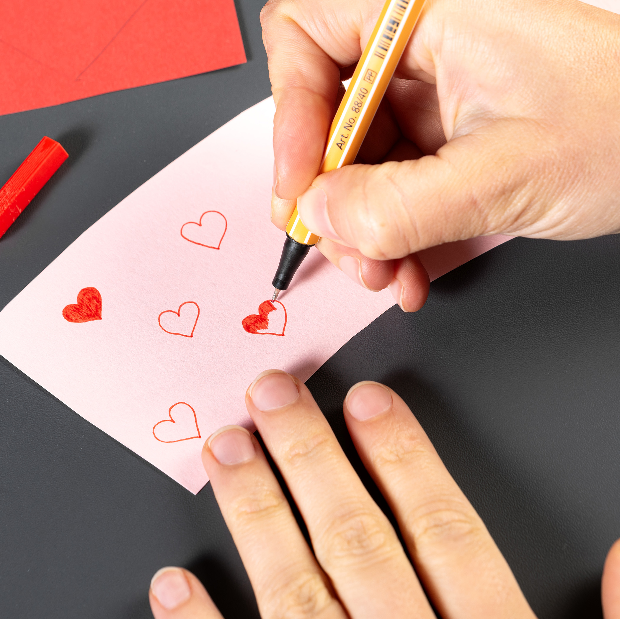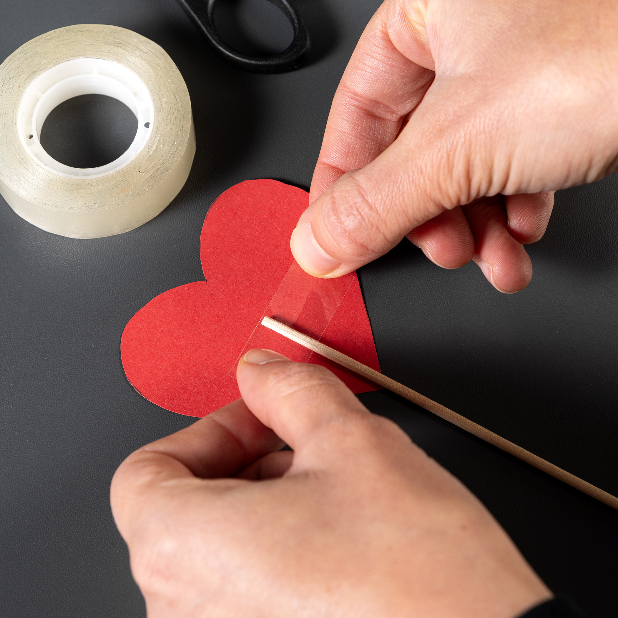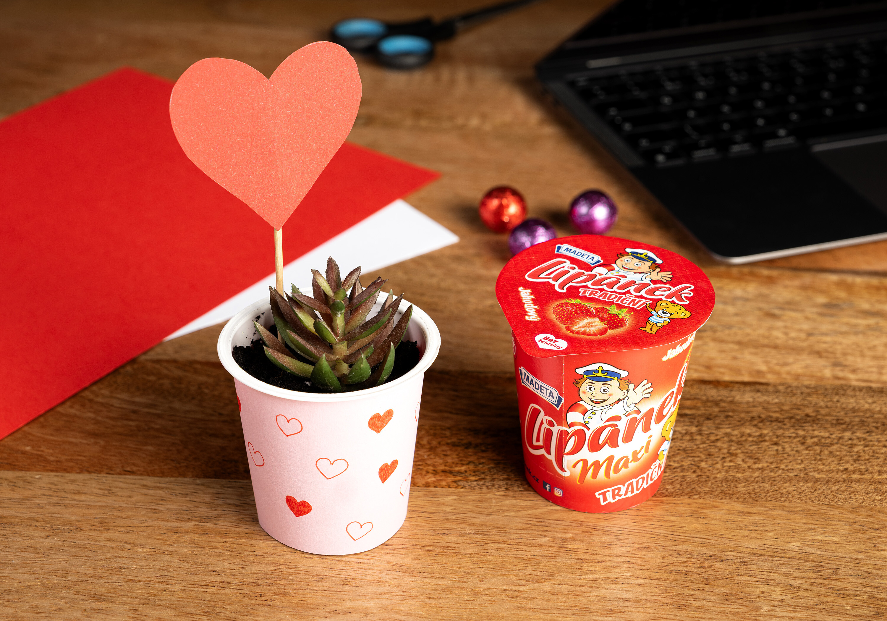 Kelímek důkladně vymyjeme a sundáme z něj papírový obal. Z růžové čtvrtky vystřihneme pás o velikosti obvodu kelímku, fixem na něj nakreslíme srdíčka a nalepíme jej na kelímek. Z červené čtvrtky vystřihneme srdíčko a izolepou na něj připevníme špejli. Kelímek použijeme jako malý květináček, do kterého připíchneme špejli se srdíčkem.