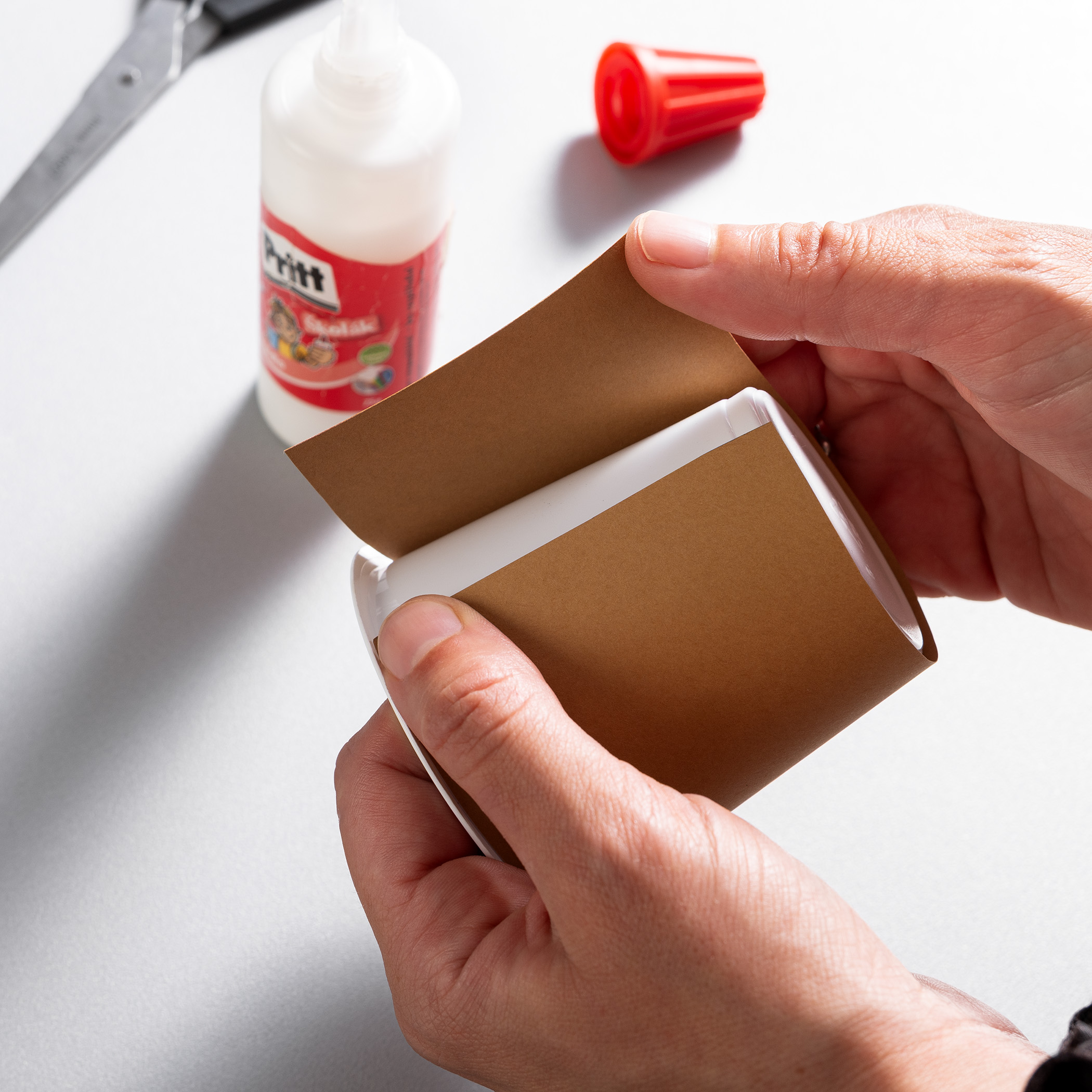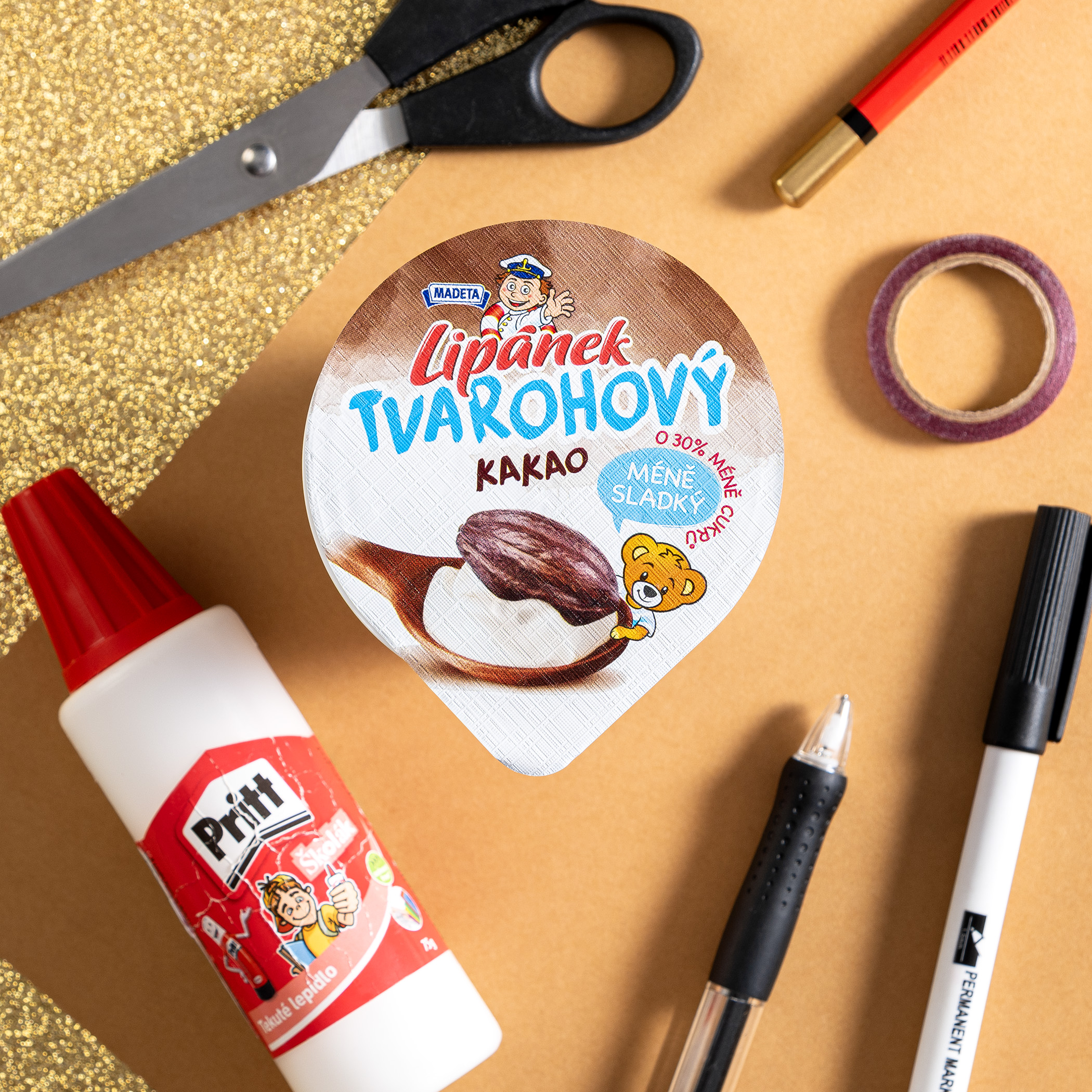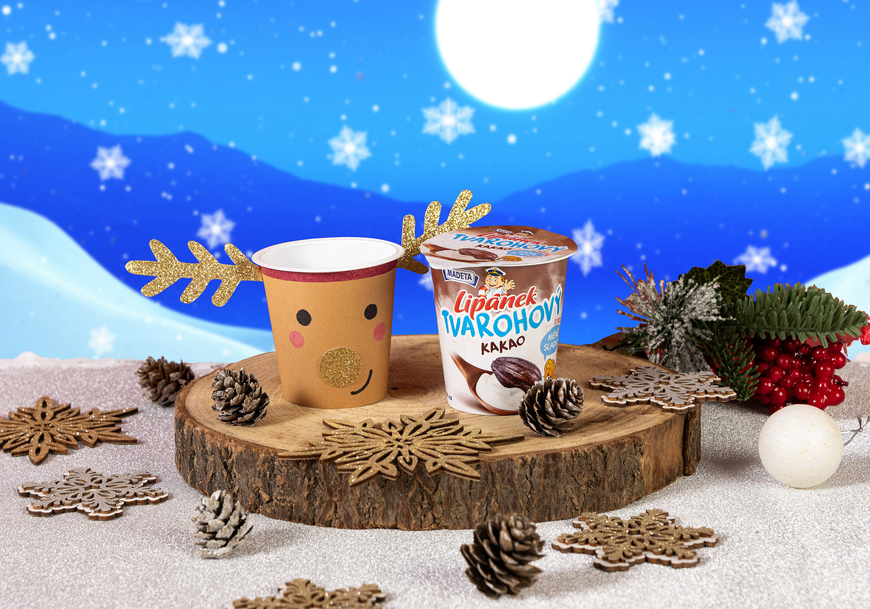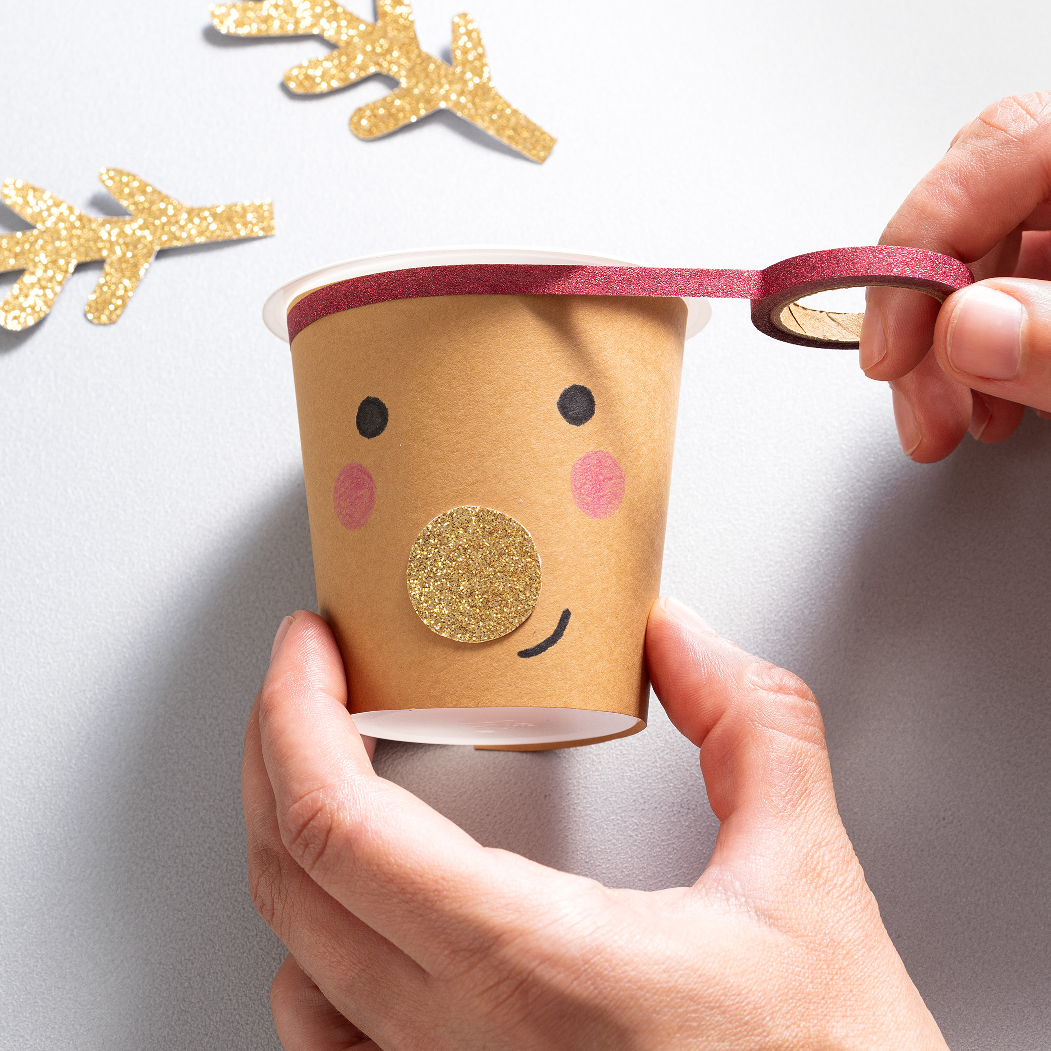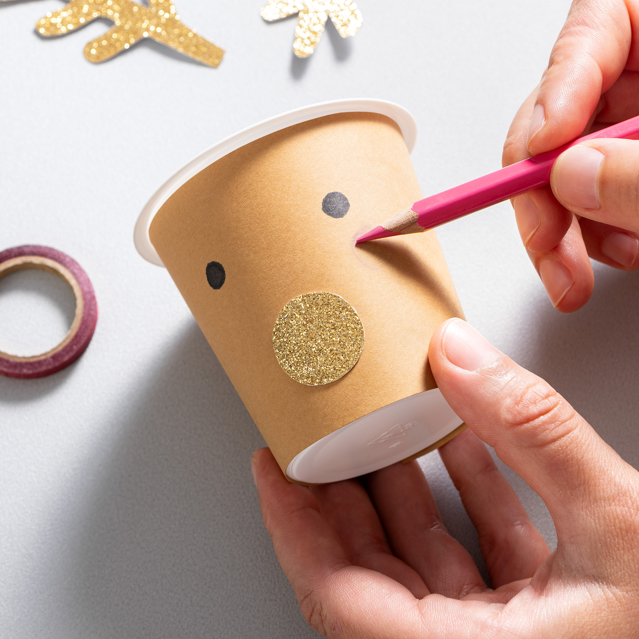 Kelímek důkladně vymyjeme a sundáme z něj papírový obal. Z hnědé čtvrtky vystřihneme pás o velikosti obvodu kelímku a nalepíme jej na kelímek. Ze zlaté čtvrtky vystřihneme kolečko jako nos a parohy a vše nalepíme na kelímek. Fixem a pastelkou dokreslíme obličej a horní část kelímku ozdobíme páskou.