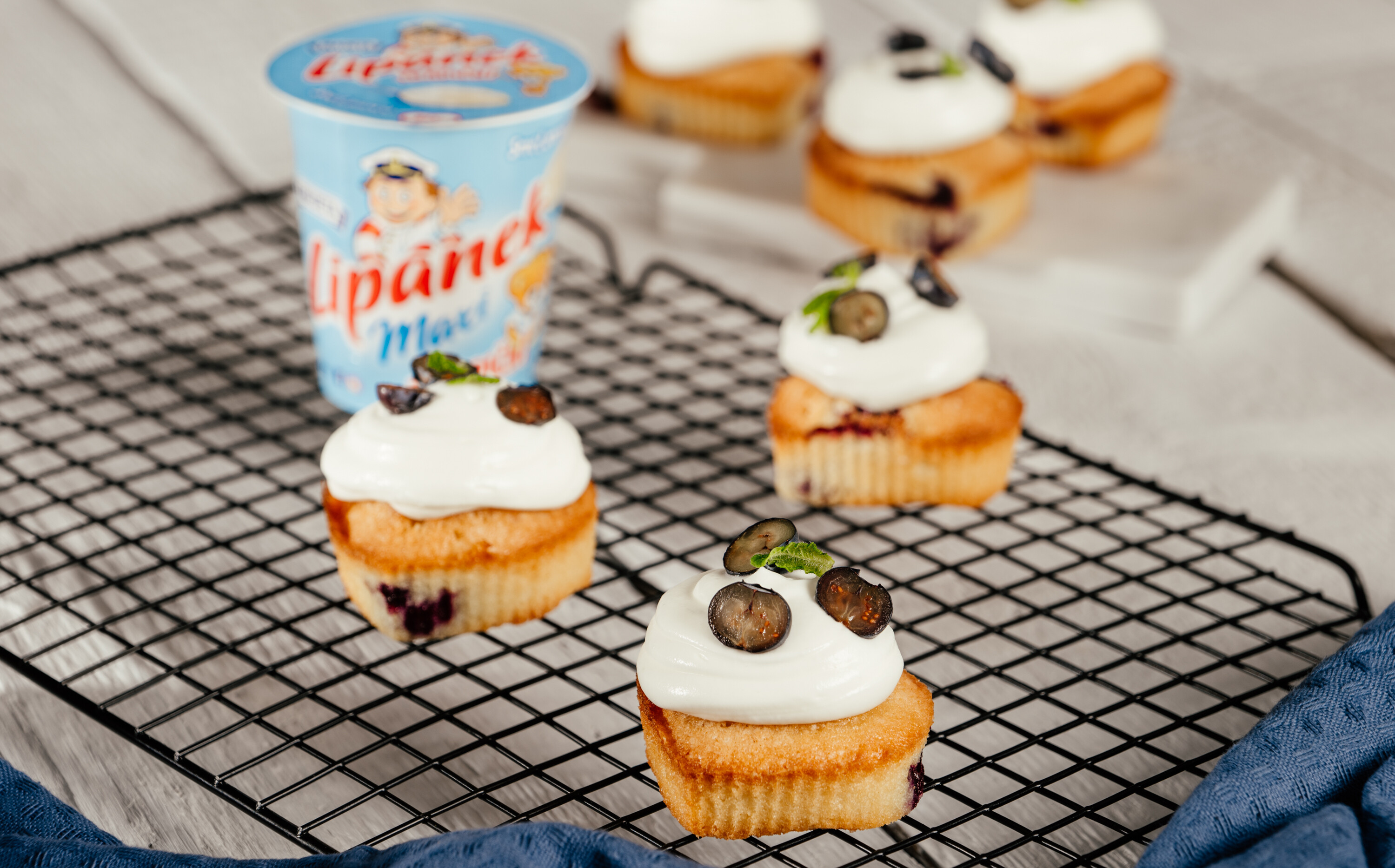 Obě mouky, jedlou sodu, prášek do pečiva, cukr a špetku soli smícháme. Změklé máslo nakrájíme a přidáme do směsi a promícháme. Přidáme žloutek, vejce, zakysanou smetanu, citronovou kůru, olej a mléko. Opět promícháme a přisypeme borůvky. Vzniklé těsto vlijeme do košíčků na cupcaky a pečeme v předehřáté troubě při 180 °C cca 20 minut. Po upečení necháme vychladnout. Trvanlivou Jihočeskou smetanu vyšleháme a smícháme s Lipánkem a dochutíme moučkovým cukrem. Směsí naplníme cukrářský pytlík a zdobíme cupcaky.