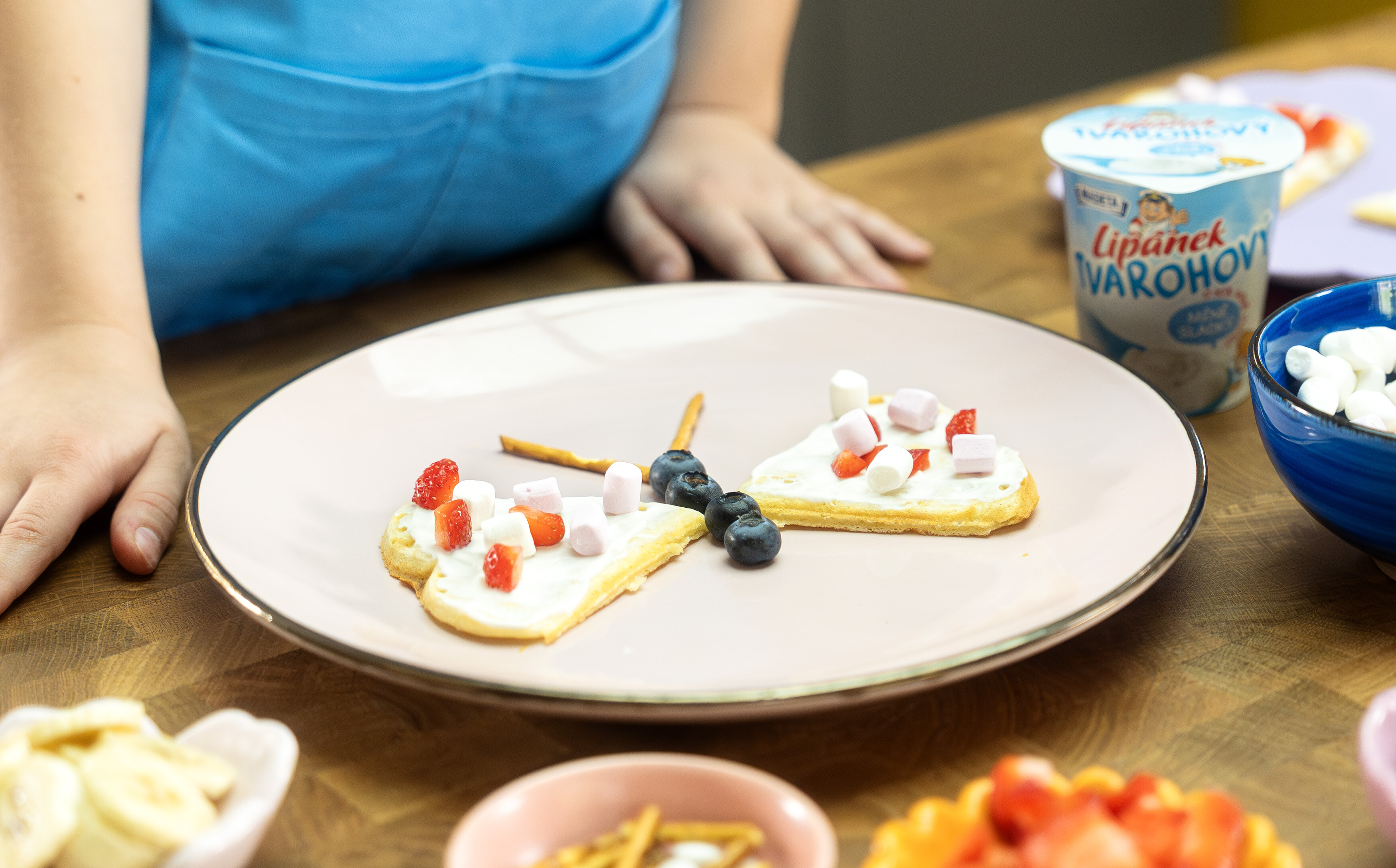 V míse smíchej obě mouky, cukr, prášek do pečiva, špetku soli, čerstvé Jihočeské mléko smíchané s vejcem a rozpuštěné Jihočeské máslo. Hotové těsto nalij do rozehřátého vaflovače a peč dozlatova. Hotové vafle potři tvarohovým Lipánkem a ozdob třeba jako motýlka nebo legrační obličej. Na tykadla použij slané tyčinky, borůvky jako tělíčko a křídla posyp jahodami a marshmallow.