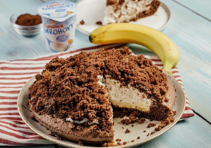 Cukr, olej, rum a žloutky ušleháme. Přidáme mouku, kakao, prášek do pečiva a trvanlivé Jihočeské mléko. Z bílků ušleháme pevný sníh a vmícháme do směsi. Vlijeme do formy vysypané moukou nebo kokosem a pečeme při 180 °C cca 30 minut. Vychladlý korpus vydlabeme, ale necháme okraje cca 1,5 cm. Vydlabanou hmotu nevyhazujeme. Ztužovač smícháme s cukrem, nahrubo nastrouhanou čokoládou a tvarohovým Lipánkem. Poté přidáme vyšlehanou smetanu. Banány podélně rozkrojíme a vložíme do vydlabaného korpusu. Na ně navrstvíme šlehačkovou náplň a vytvoříme kopeček. Posypeme vnitřkem korpusu a necháme v lednici pár hodin vychladnout.