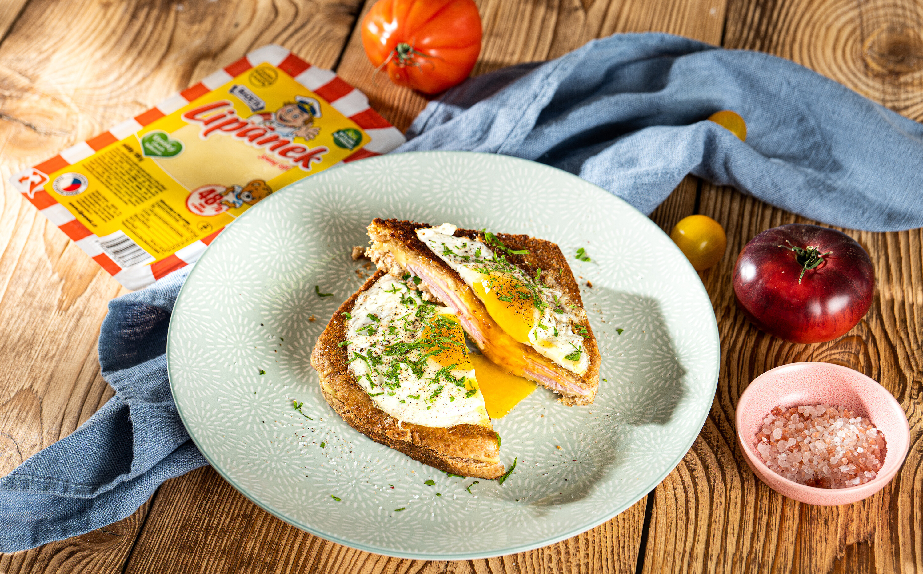 Opečený sendvič se sýrem Lipánek, šunkou a volským okem