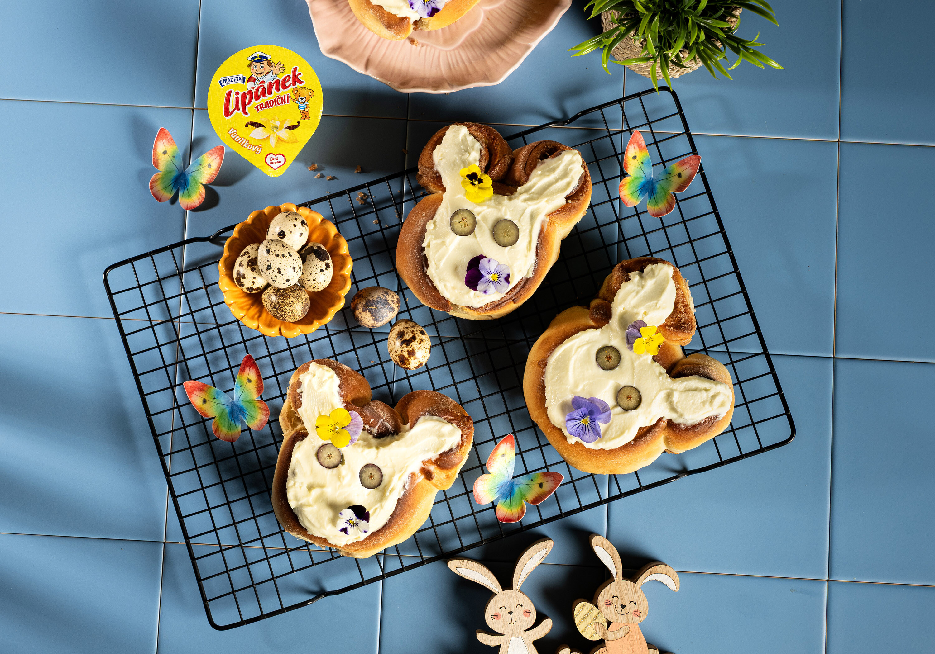 Droždí s cukrem rozmícháme ve vlažném čerstvém Jihočeském mléce a necháme asi 5 minut vzejít kvásek. Do mísy přidáme cukr, Jihočeské máslo, vejce, mouku, sůl a tradičního Lipánka, přilijeme kvásek a vypracujeme hladké pružné těsto. Přikryté ho necháme kynout asi hodinu na teplém místě, dokud nezdvojnásobí objem. Změklé Jihočeské máslo smícháme s cukrem a skořicí. Vykynuté těsto rozválíme na plát silný asi půl centimetru a rovnoměrně ho potřeme skořicovou směsí, srolujeme do rolády a nakrájíme na cca 3 cm široké kousky. Každý kousek lehce rozvineme a vytvarujeme z něj králičí ouška. Hotové králíčky dáme na plech, krátce zchladíme v mrazáku a následně necháme ještě 30 minut kynout. Troubu předehřejeme na 180–200 °C a králíčky pečeme 15–20 minut dozlatova. Mezitím si smícháme tradičního Lipánka s moučkovým cukrem a špetkou soli do hladkého krému a upečené vychladlé králíčky tímto krémem potřeme.