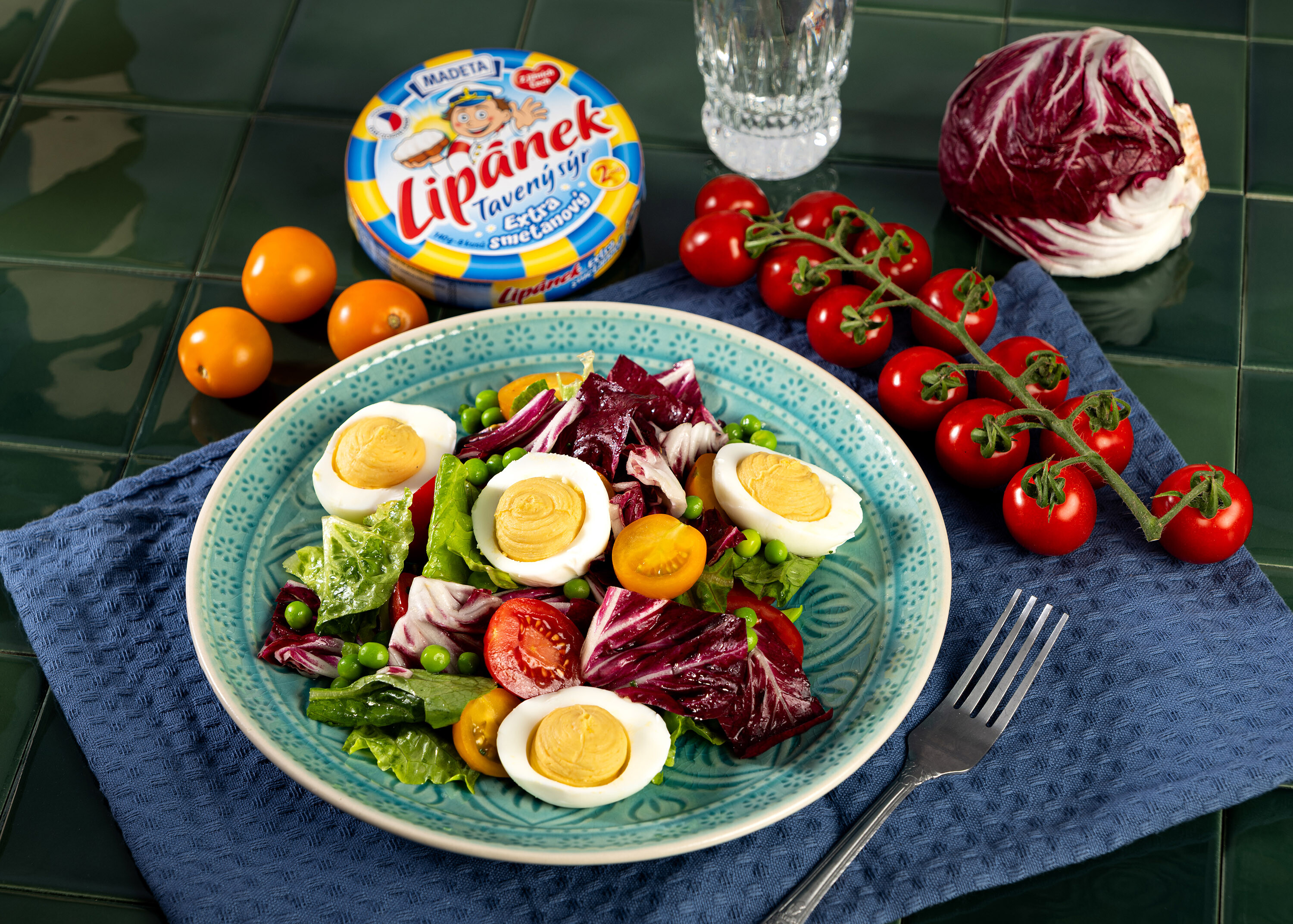 Salát s vejcem plněným směsí ze žloutků, taveného sýru Lipánek a hořčice