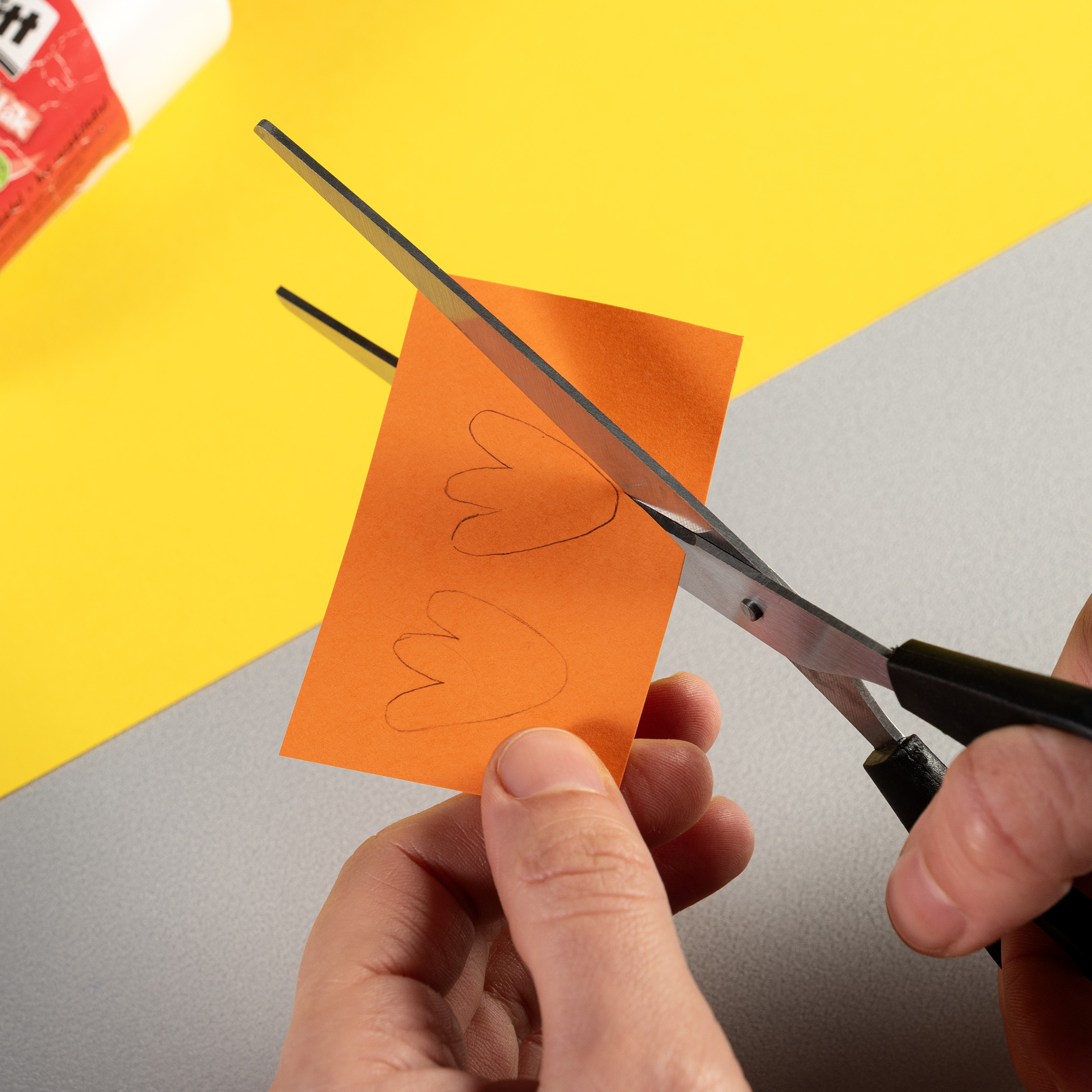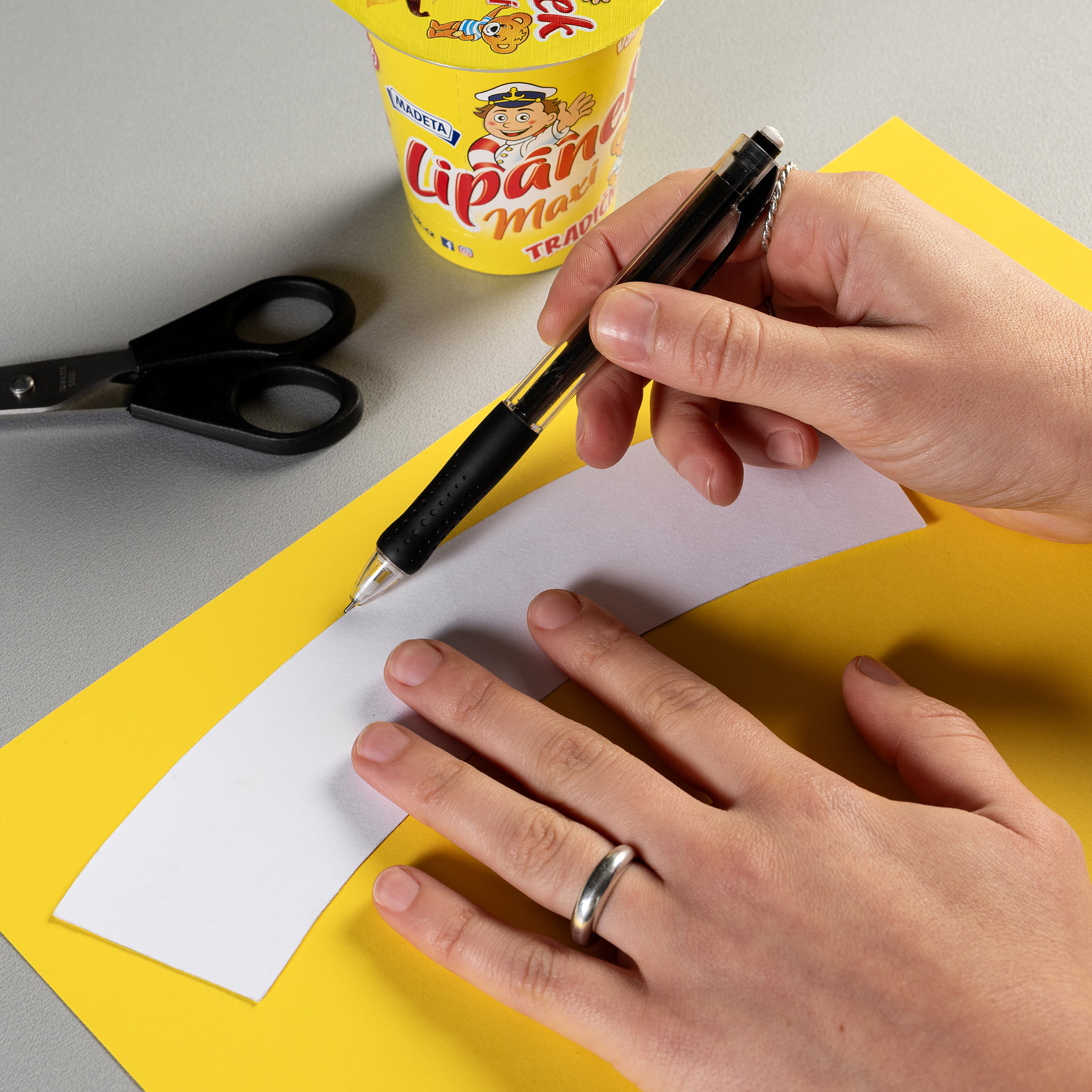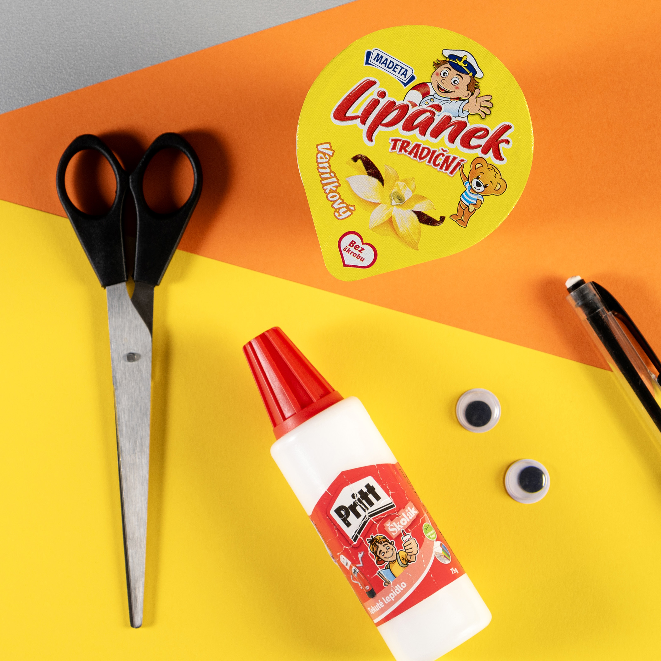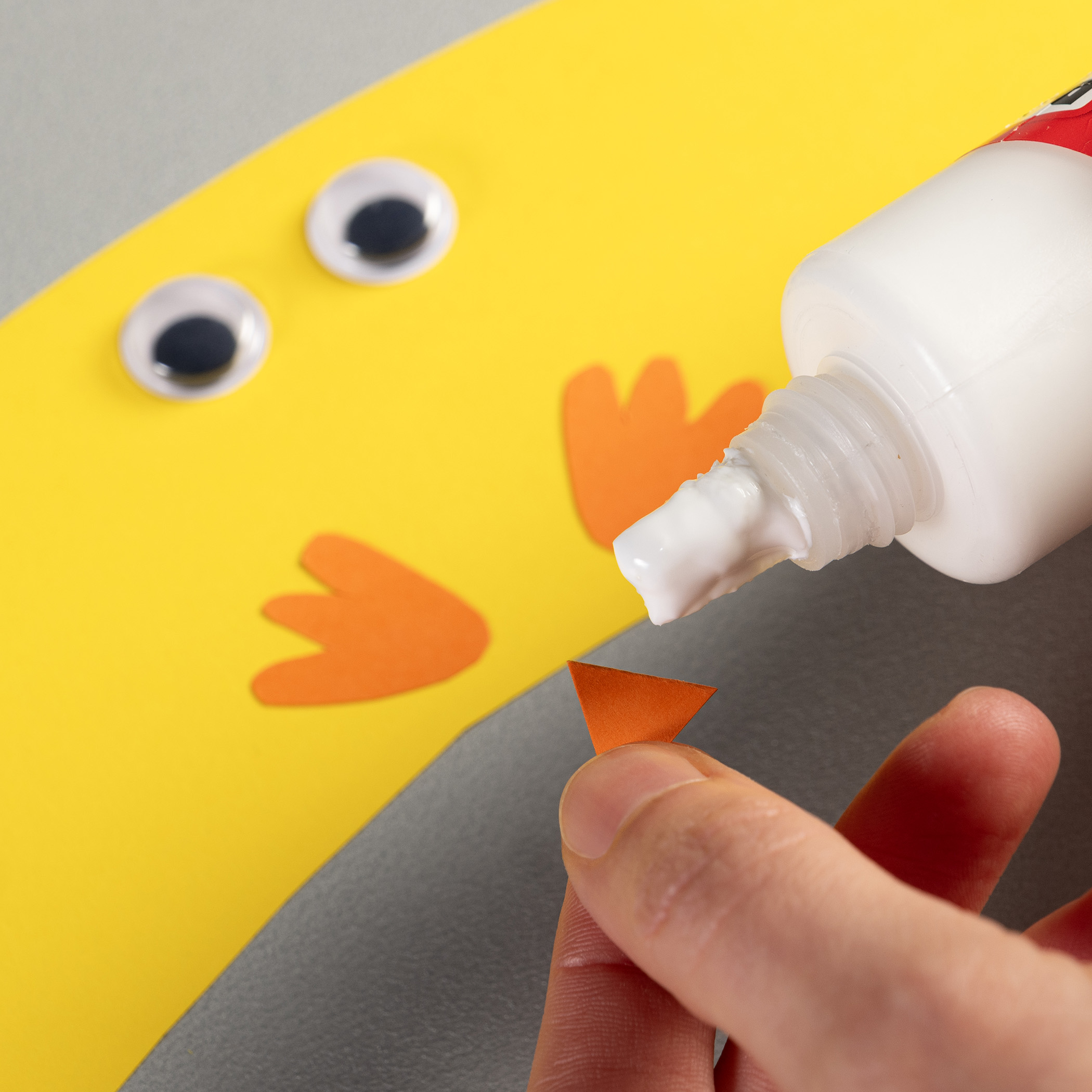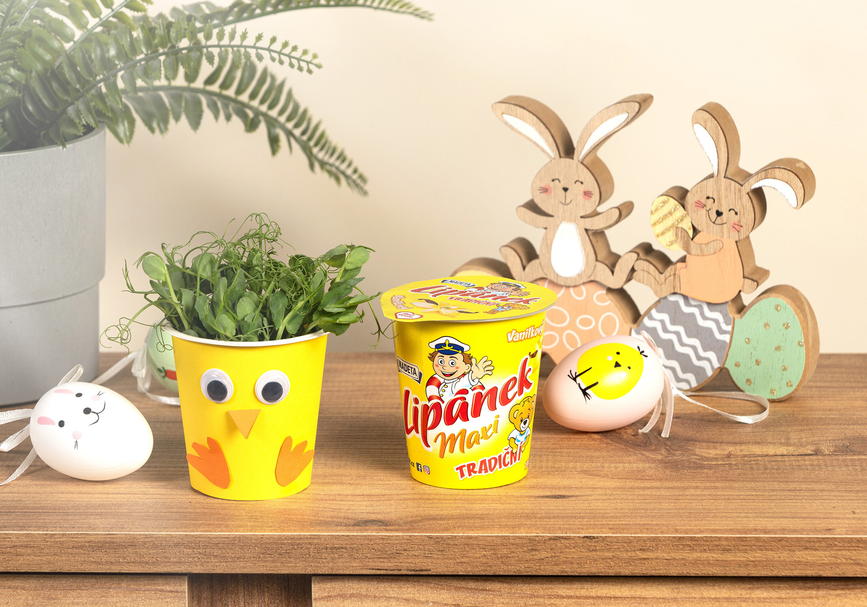 Kelímek důkladně vymyjeme a sundáme z něj papírový obal. Ze žluté čtvrtky vystřihneme pás o velikosti obvodu kelímku a nalepíme jej na kelímek. Z oranžové čtvrtky vystřihneme dvě nožičky a zobáček a přilepíme na kelímek spolu s plastovými očičky. Kelímek můžeme použít jako květináček a vysadit do něj jarní osení či řeřichu.