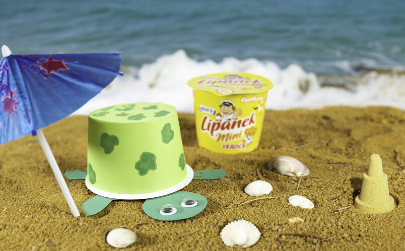 Kelímek důkladně vymyjeme a sundáme papírový obal. Ze světle zelené čtvrtky vystřihneme pás o velikosti obvodu kelímku a kruh o velikosti dna. Fixem nakreslíme na čtvrtku skvrny a nalepíme na kelímek. Z tmavě zelené čtvrtky vystřihneme tělo želvičky a nalepíme na kelímek. Přilepíme očička a veselá želvička je hotová.
